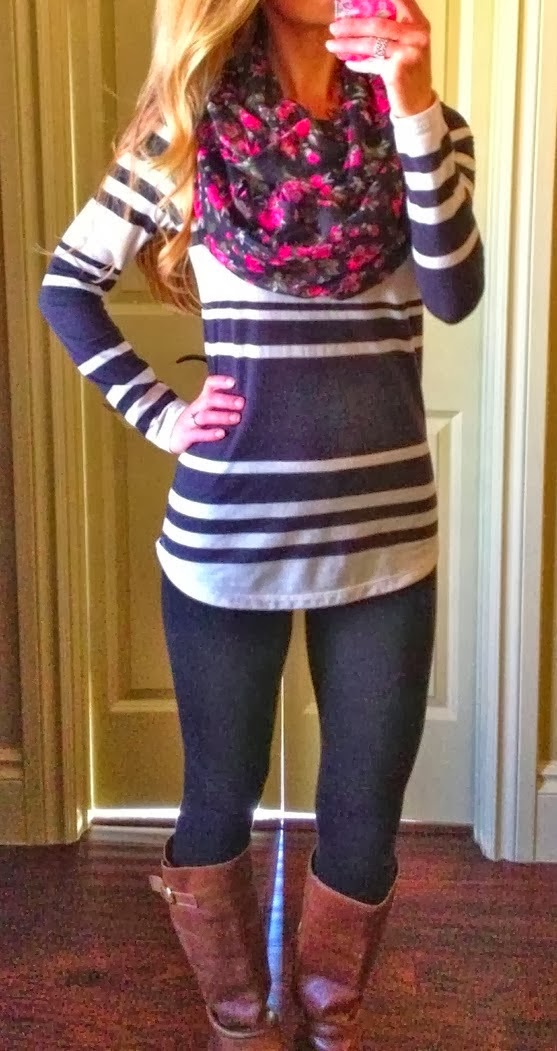 Floral Scarf, Stripe Sweater Shirt, Leggings And Boots For Fall